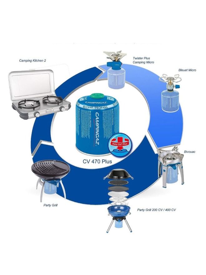 Campingaz® valve cartridge with high-performance butane/propane mix. For use with Campingaz Easy Clic® Plus appliances this cartridge has a self-sealing safety valve - simply push and turn the device onto the cartridge until you hear a click for a secure and tight connection. The cartridge can be removed and re-attached, even if not yet empty - an ideal solution if you need to operate multiple devices or transport your cartridge between uses.