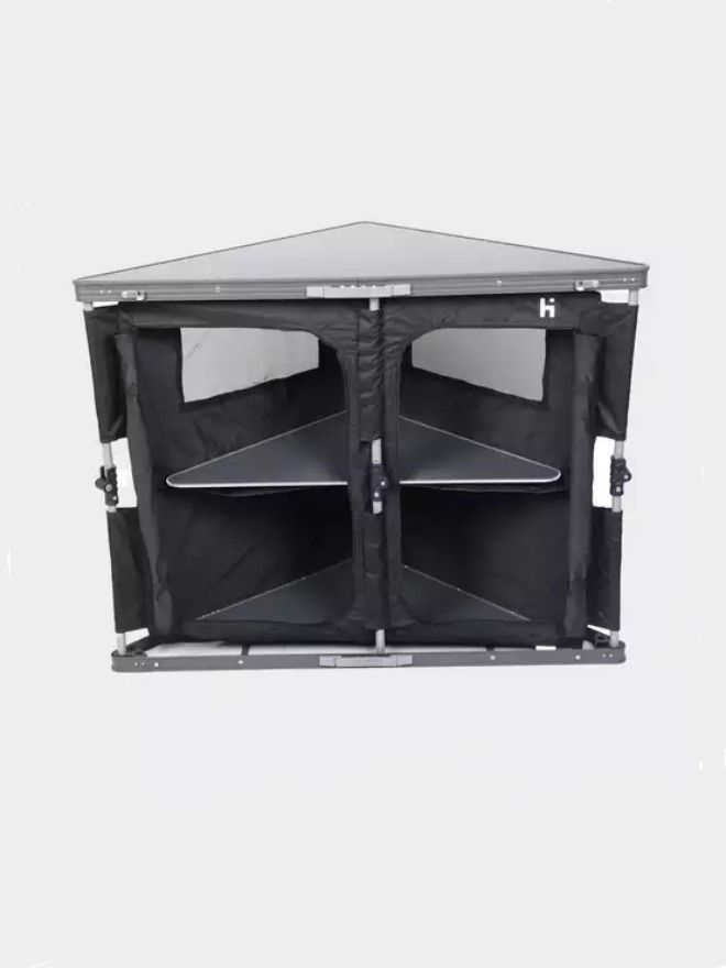 Mesh doors promote ventilation and allow you to see inside without opening the secure closures. The powder-coated aluminium frame is light yet strong, and folds down neatly between camping adventures.